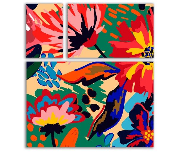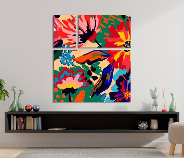 Simetría de 3 Cuadros Decorativos combinados de flores con múltiples colores intensos para decorar el living, tu cuarto o la oficina, generando una figura alegre y con mucha vida.