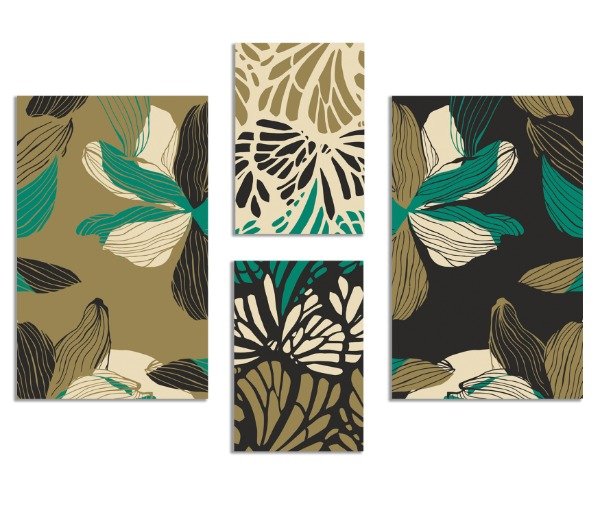 Simetría de 4 Cuadros Decorativos combinados de plantas con hermosos tonos tierra para decorar el living, tu cuarto o la oficina, creando juntos una figura profunda y vital.