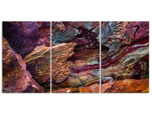 Simetría de 3 Cuadros Decorativos combinados que muestran el imponente corte de las vetas de rocas de una montaña o cañón de colores violáceos, rosados y anaranjados que la naturaleza crea para que disfrutes desde el living, tu cuarto o la oficina.