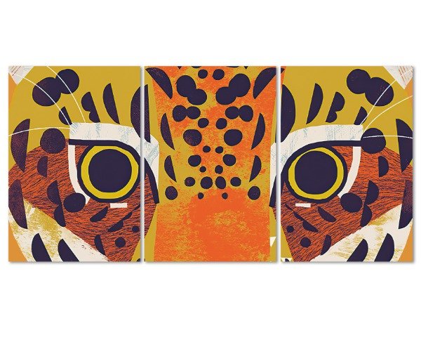 Simetría de 3 Cuadros Decorativos combinados que muestran artísticamente la mirada fija y profunda de un tigre bellísimo que nos observa desde el living, tu cuarto o la oficina; destacando los amarillos, marrones y negros típicos de la especie.