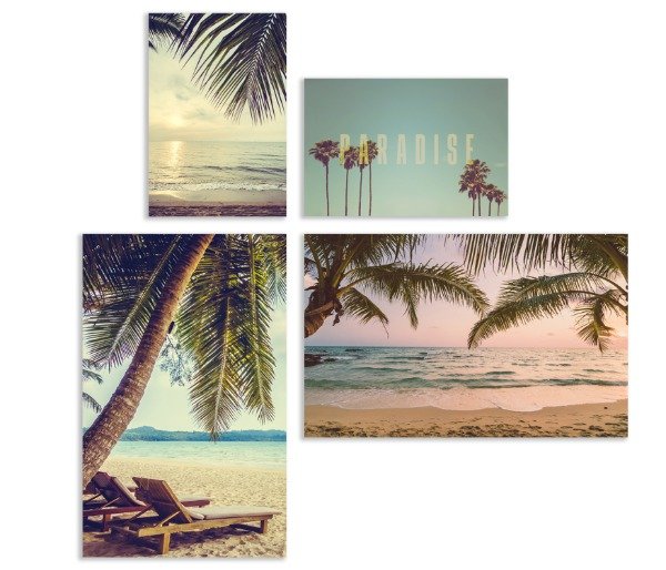 Simetría de 4 Cuadros Decorativos combinados con hermosos paisajes de mar y playas paradisíacas con palmeras, ideales para decorar el living, tu cuarto o la oficina, creando un collage tipo ventanal.