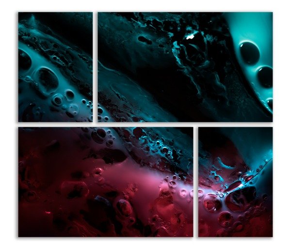 Simetría de 4 Cuadros Decorativos combinados que muestran una combinación artística de colores turquesa y bordó licuándose para formar una figura abstracta desde un enfoque cercano para generar una gran imagen llena de potencia visual. Las sombras colaboran para generar una expresión casi tridimensional que renovará cualquier ambiente, ya sea el living, tu cuarto o la oficina, creando un moderno collage.