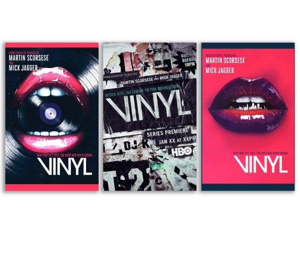 Simetría de 3 Cuadros Decorativos combinados con imágenes rojinegras de las promociones de Vinyl, la serie inconclusa sobre el rock de los 70s de Martin Scorsese con producción de Mick Jagger, que millones amaron y siguen esperando secuelas.