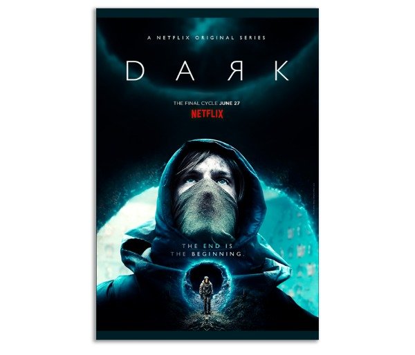 Póster Decorativo de la gran serie alemana "Dark" que atrapó con sus 3 temporadas a millones de jóvenes y adultos de todo el mundo. El negro profundo y los azules turquesas se destacan con la icónica figura del actor Louis Hofmann.